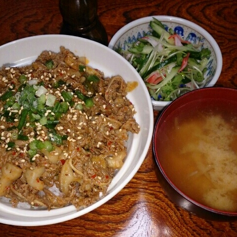 ガラスーブの元を少々、酒少々加えキムチを加え炒めあわせ程よく水分を飛ばし丼に盛ってネギ白ゴマ降って頂きましたよ