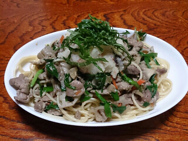 茹でたパスタを加えあえ、サラに盛り、鰹梅を加えた大根おろしと大葉を乗せ完成
