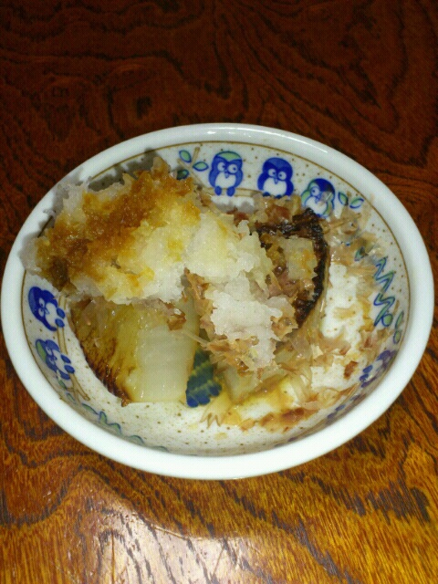 大根おろしと鰹節をのせて、醤油をちろっとかけていただきます