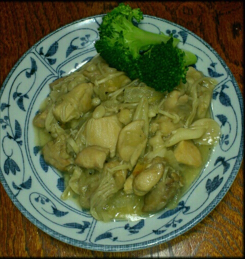 鶏ガラスープ200ccを入れ、茸も入れ塩胡椒して煮詰めて出来上がり
