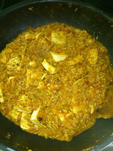 混ぜ合わせて豆腐とガラムマサラを入れる