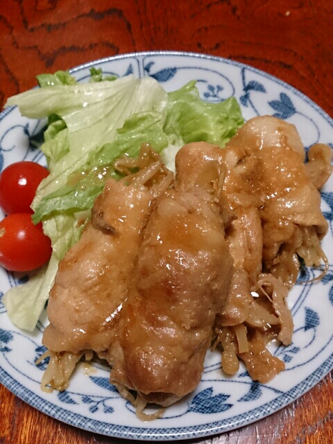 もやしとしめじを豚肉で巻いて生姜醤油で絡めたの