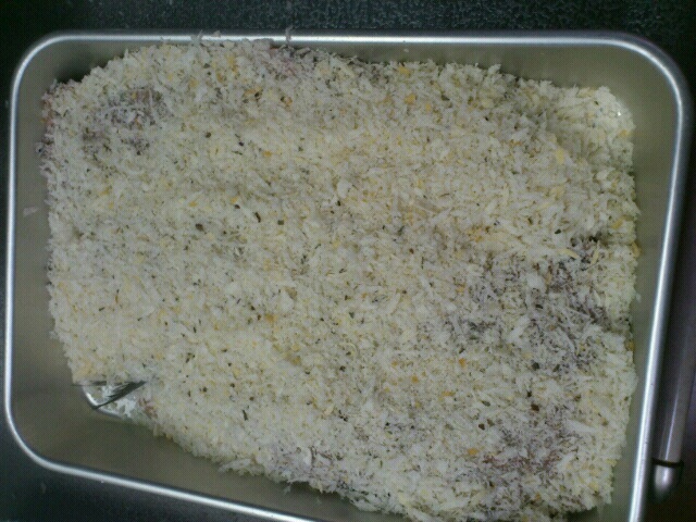 パン粉にガーリックパウダーとドライバジルを混ぜイワシにつける