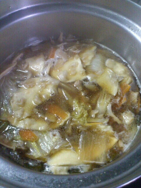 鶏むね肉一枚を一口大に切って油で炒め水、昆布、ゴボウ、人参、大根、しめじ、白菜を加えて煮る