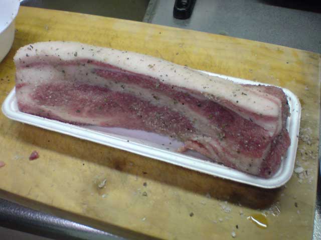 豚の塊肉に塩をすり込み