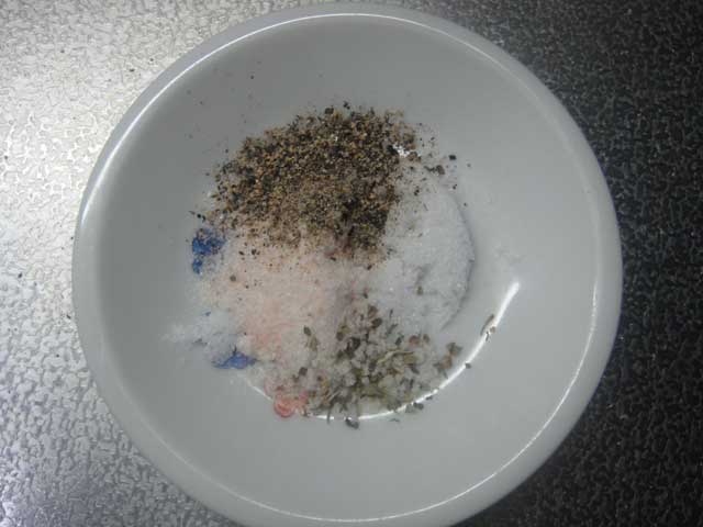 右:塩、:下:バジルソルト、左:岩塩、上:黒コショウ