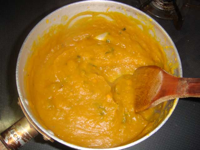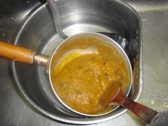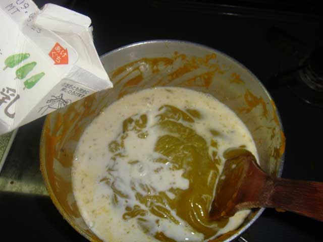 それを鍋に戻し、温めながら牛乳を加える
