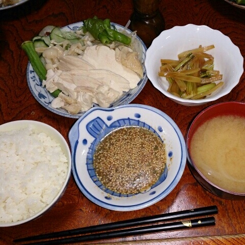 タレ:ニンニク、生姜、ネギ、それぞれみじん切り、醤油大2、酢小1、豆板醤小1、鰹梅小2、すりごま大2を混ぜて鶏の蒸し汁で伸ばした